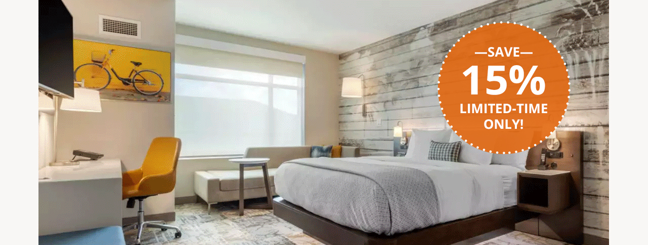 1 Subject to availability at participating hotels. Hotel reservations must be made by 07/31/2019 and stay completed by 08/31/2019. A stay includes all consecutive nights at the same hotel regardless of check-ins or checkouts. Only valid for qualifying stays, which exclude rooms booked below certain rates, reward night stays, complimentary rooms, rooms paid for as part of a convention or meeting, rooms booked through a travel agent or third party online retailer including online travel agencies, wholesale packages, group tours, and stays booked using the employee discount or the friends, family and associate discount. Reservations must be made using the link provided in this email. This offer is a 15% discount off Best Available Rate, and cannot be combined with any other discounts, promotions, or offers. Email offer is valid only for use by and for intended recipient. Discount will be applied immediately upon booking the room. Offer is valid for one time use only for a stay completed by August 31, 2019. Choice Hotels reserves the right to change or discontinue this offer at any time. Available to U.S. and Canadian residents only. Hotels are independently owned and operated.