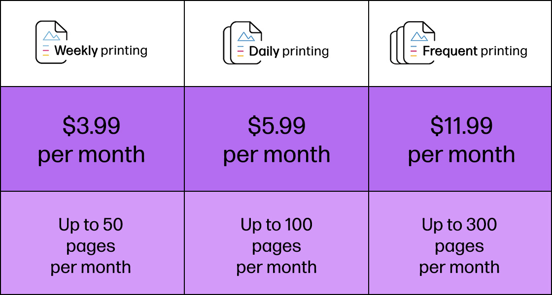 | Pick a monthly subscription print plan for your printing needs. Unused pages roll over to the next month, up to a maximum of 3 times your monthly plan4. |