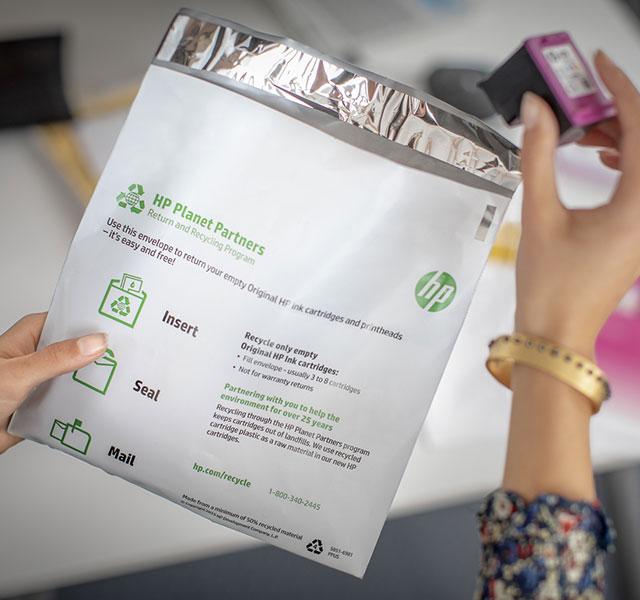 | HP uses recycled content to make 100% of Original HP toner cartridges and 85% of Original HP ink cartridges. Instant Ink subscriptions include a prepaid recycling envelope for easy returns.6 |