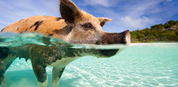 Visit Exuma, a chain of Bahamian islands that are home to the famous swimming pigs.