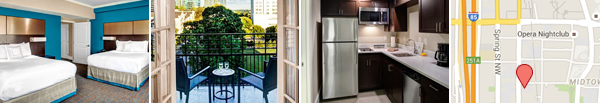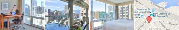 | Spread out in a suite near the city's top attractions – hockey, food trucks and Stanley Park are all nearby. |