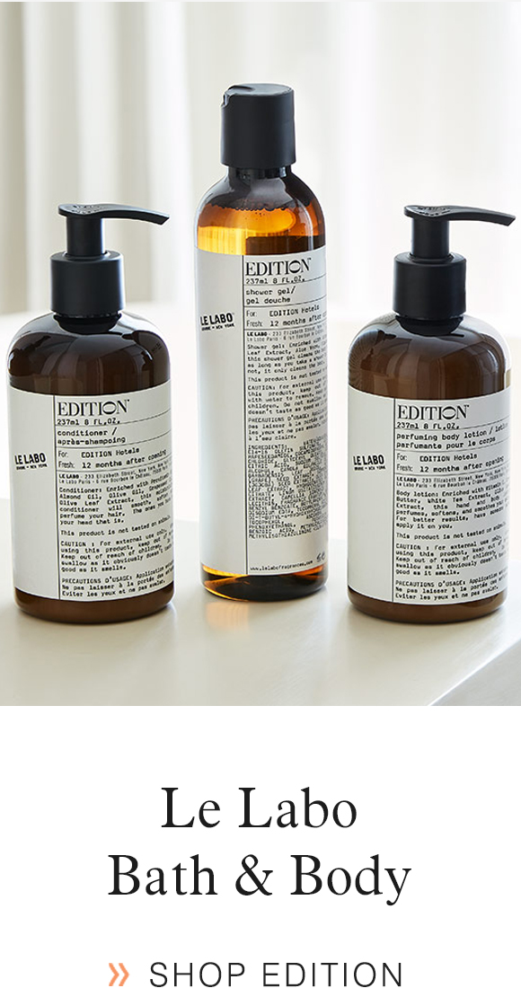 | Take us home with you. From our signature black tea scent to our luxurious bedding and plush robes, the EDITION hotel collection was crafted just for you. Spoil yourself with our assortment of home essentials representing a new generation of luxury.