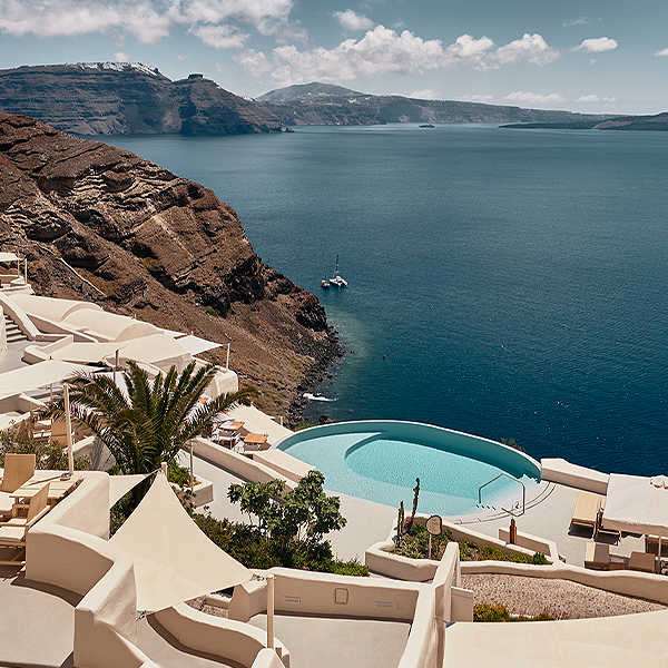 Enjoy a freshwater pool dip while indulging in mesmerizing views of the caldera and Aegean Sea at the Mystique, a Luxury Collection Hotel, Santorini.