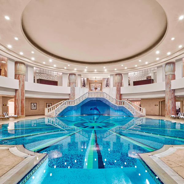 The JW Marriott® Hotel Cairo offers its own private water park with multiple swimming pools, a kids area, and a large fountain made to look like ancient gates.