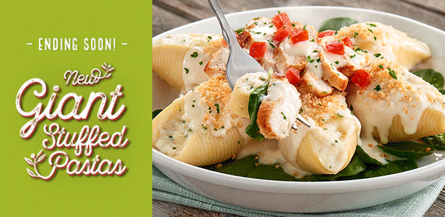 It’s your last chance to enjoy our Giant Stuffed Pastas before they’re gone. Chose from 4 abundantly filled pastas, plus all the soup or salad and breadsticks you want.