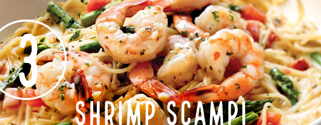 Light in calories, but not in flavor, savor sautéed shrimp, tossed with asparagus, tomatoes and angel hair pasta.