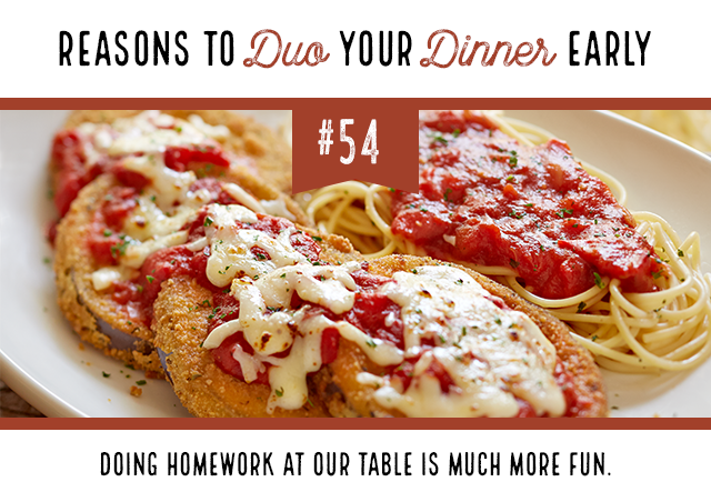 Every Monday through Thursday, come in early and get what you love for less. Create over 50 combinations with one of your favorite dishes, plus all the soup or salad and our famous breadsticks you want. Just $8.99.