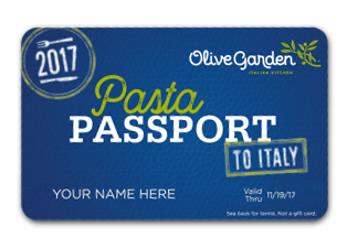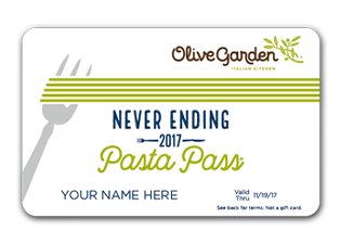 Never Ending Pasta Pass holder may redeem for unlimited Never Ending Pasta Bowl (NEPB) meals 9/25/2017–11/19/2017. Dine-in only. Offer is valid at any Olive Garden location in the U.S. (excluding Puerto Rico). Not valid for online or ToGo orders. Present to server at time of ordering. One redemption per visit. Each NEPB meal consists of pasta, sauce and a single topping serving from the promotional menu. All other entrées excluded. Each meal is for one person and may not be shared. Excludes gratuity, alcohol and any other menu item not listed herein. Pass is not a gift card and is not reloadable' is non-transferable without permission, holds no value and amount paid (if applicable) is non-refundable. Guest must be 18+ to purchase/use Pass. Use signifies agreement to all terms and Olive Garden's Privacy Policy www.olivegarden.com/privacy-policy. Questions? You many contact Olive Garden Guests Relations at (844) 209-3484. Expires 11/19/2017.