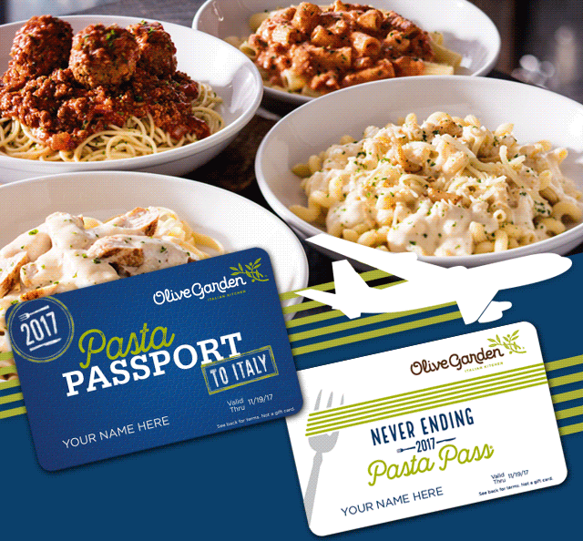 Never Ending Pasta Pass holder may redeem for unlimited Never Ending Pasta Bowl (NEPB) meals 9/25/2017–11/19/2017. Dine-in only. Offer is valid at any Olive Garden location in the U.S. (excluding Puerto Rico). Not valid for online or ToGo orders. Present to server at time of ordering. One redemption per visit. Each NEPB meal consists of pasta, sauce and a single topping serving from the promotional menu. All other entrées excluded. Each meal is for one person and may not be shared. Excludes gratuity, alcohol and any other menu item not listed herein. Pass is not a gift card and is not reloadable' is non-transferable without permission, holds no value and amount paid (if applicable) is non-refundable. Guest must be 18+ to purchase. Use signifies agreement to all terms and Olive Garden's Privacy Policy www.olivegarden.com/privacy-policy. Questions? You many contact Olive Garden Guests Relations at (844) 209-3484. Expires 11/19/2017.