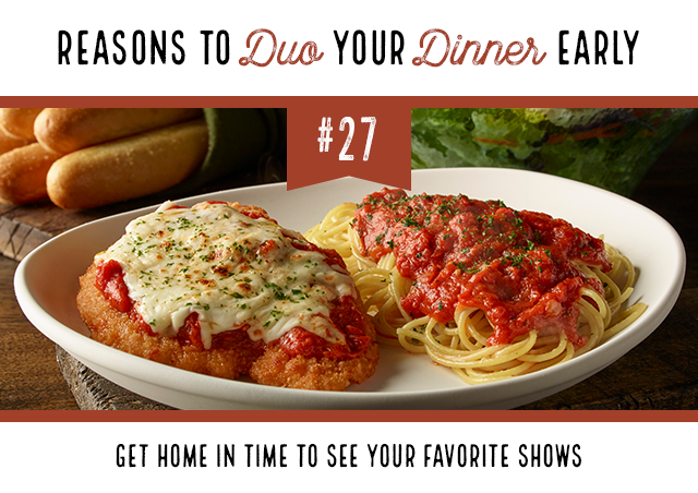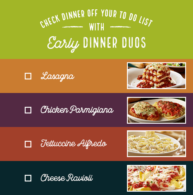 Every Monday through Thursday, join us from 3 to 5 p.m. and pair 1 of 11 entrée options with all the soup or salad and breadsticks you want.