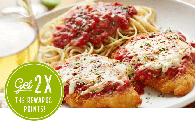 Double points can be earned on qualifying purchases excluding gift cards, alcohol (where prohibited by state law), tax and gratuity. Minimum spend required is the total excluding alcohol (where prohibited by state law), gift card purchases, coupon discounts, bonus cards, tax and gratuity. Offer valid only at participating Olive Garden Italian Restaurant locations in the continental United States. Valid 1/3/2018–1/10/2018. Rewards membership and the earning and redemption of rewards and points are subject to the Reward Terms. Only available in select markets at this time. See our complete list of participating locations.