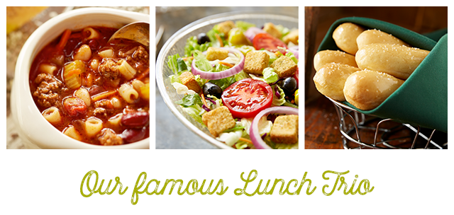 Join us for lunch and get our famous lunch trio—unlimited soup, salad and breadsticks.