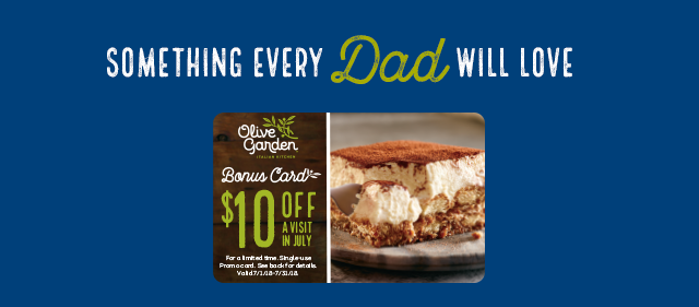 Give Dad an Olive Garden gift card and get a $10 Bonus Card* for every $50 spent.