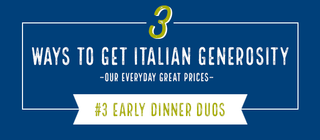 Join us Monday through Thursday from 3 to 5 p.m. for some of your favorite dishes paired with all the soup or salad and breadsticks you want.