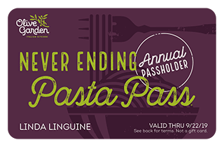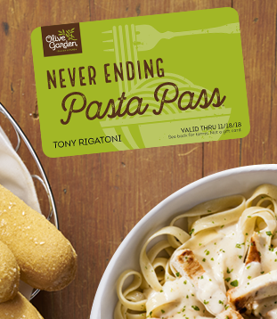 Annual Pasta Pass Present pass to server at time of ordering along with a photo ID. Named Passholder may redeem for unlimited Never Ending Pasta Bowl® (NEPB) meals 9/24/18–9/22/19, excluding 11/22/18 and 12/25/18 (restaurants closed for holidays). Each "NEPB meal" consists of pasta, available sauces and a single topping serving from the promotional NEPB menu. All other entrées excluded. Each meal is for one person and may not be shared. Dine-in only. Valid at any Olive Garden location in the U.S. (excl. Puerto Rico). Not valid for online or ToGo orders. One redemption per visit. Excludes gratuity, alcohol and any other menu item not listed herein. Pass is not a gift card and is not reloadable; is non-transferable without permission, holds no value and amount paid (if applicable) is non-refundable. Use signifies agreement to all terms and Olive Garden's Privacy Policy (www.olivegarden.com/privacy-policy). Questions? Olive Garden Guest Relations, (844) 209-3484. Expires 9/22/19. © 2018 Darden Concepts, Inc.
