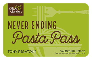 Individual Pasta Pass Present pass to server at time of ordering along with a photo ID. Named Passholder may redeem for unlimited Never Ending Pasta Bowl® (NEPB) meals 9/24/18–11/18/18. Each "NEPB meal" consists of pasta, sauce and a single topping serving from the promotional NEPB menu. All other entrées excluded. Each meal is for one person and may not be shared. Dine-in only. Valid at any Olive Garden location in the U.S. (excl. Puerto Rico). Not valid for online or ToGo orders. One redemption per visit. Excludes gratuity, alcohol and any other menu item not listed herein. Pass is not a gift card and is not reloadable; is non-transferable without permission, holds no value and amount paid (if applicable) is non-refundable. Use signifies agreement to all terms and Olive Garden's Privacy Policy (www.olivegarden.com/privacy-policy). Questions? Olive Garden Guest Relations, (844) 209-3484. Expires 11/18/18. © 2018 Darden Concepts, Inc.