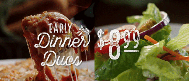 Join us Monday through Thursday from 3 to 5 p.m. for some of your favorite dishes paired with all the soup or salad and breadsticks you want.