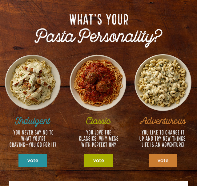 Whatever your pasta personality is, with Never Ending Pasta Bowl you can creative over 100 combinations of your favorite pastas, sauces and toppings.