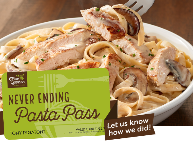 We hope you enjoyed your Pasta Pass℠. We'd love for you to take a quick survey and tell us about your experience.