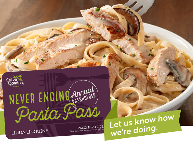We hope you are enjoying your Annual Pasta Pass. We'd love for you to take a quick survey and tell us about your experience so far.