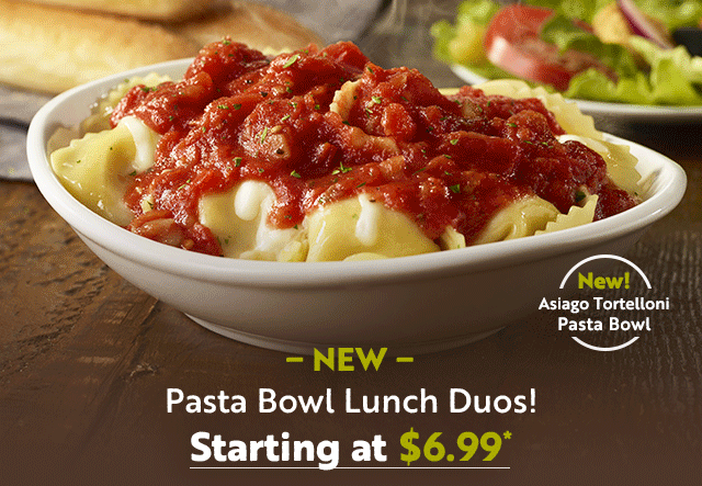 Choose from 1 of 11 Lunch Duo entrées, like our two new Pasta Bowls, plus all the soup or salad and breadsticks you want.