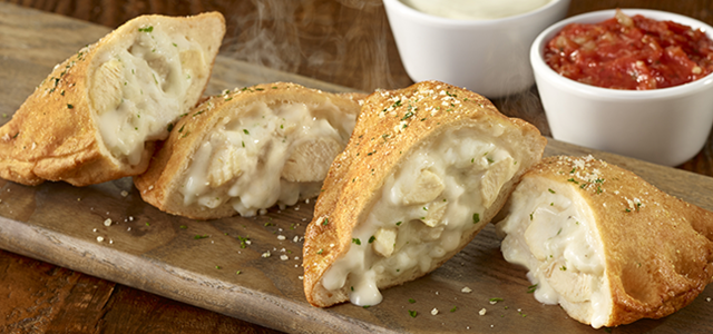 Golden fried pizza dough filled with chicken, cheese and alfredo sauce, you'll want to try our new limited-time appetizer.