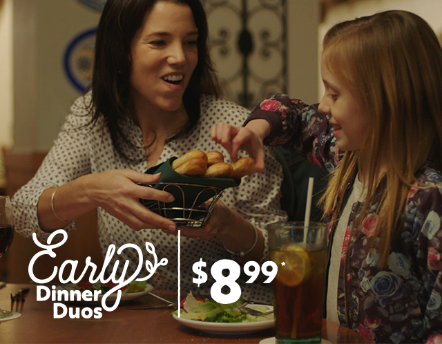 Join us every Monday through Thursday from 3 to 5 p.m. for some of your family's favorites paired with unlimited soup or salad and breadsticks. All for $8.99*.