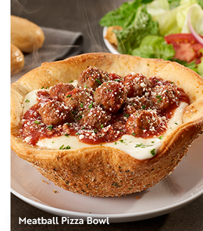 A twist on pizza, try our cheese filled pizza bowl topped with meatballs.