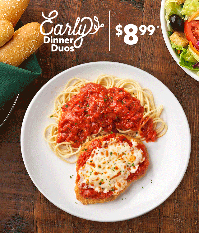 Enjoy some of your favorites paired with unlimited soup or salad and breadsticks for $8.99* when you join us from 3 to 5 p.m. Monday through Thursday.