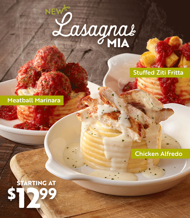 Create your own lasagna with our New! Lasagna Mia. Start with our New! Four Cheese Lasagna Rollata and then top it with your choice of sauce and topping.