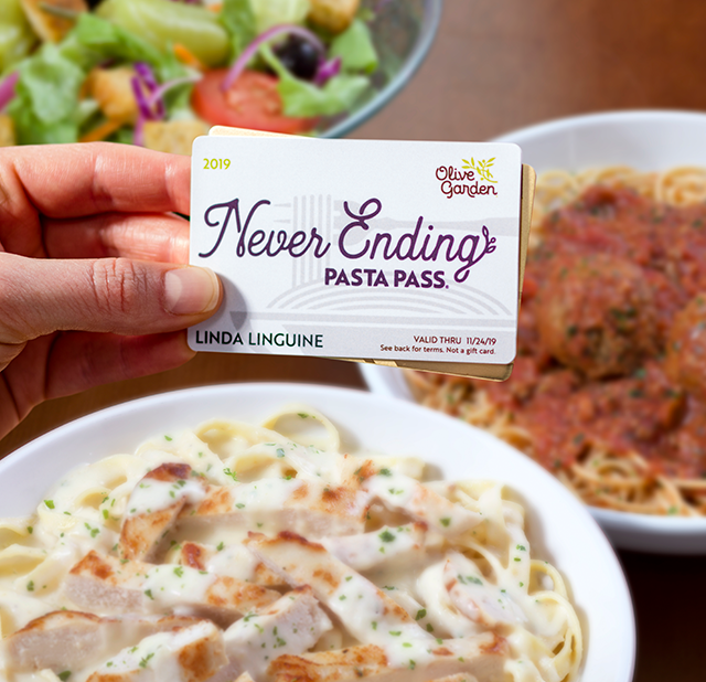 Valid for use by Named Passholder only. Present pass to server at time of ordering. Expires upon death of Named Passholder, sale or termination of issuer, or as otherwise set forth at (www.olivegarden.com/LifetimePastaPass). Named Passholder may choose from select menu items, as designated at (www.olivegarden.com/LifetimePastaPass) which may change from time-to-time, while supplies last. Restrictions and limitations apply to qualifying menu items. All other menu items excluded from offer. One redemption per restaurant visit. Each meal is for one person and may not be shared. Restaurants closed for holidays. Dine-in only. Not valid for online or ToGo orders. Excludes gratuity, alcohol, and any other menu item not included in offer. Valid at participating Olive Garden locations in the continental U.S. Pass is not a gift card and is not reloadable; is non-transferable without permission, holds no value amount paid (if applicable) & is non-refundable. Use signifies agreement to, and acknowledges all terms and information located at (www.olivegarden.com/LifetimePastaPass) & Olive Garden’s Privacy Policy (www.olivegarden.com/privacy-policy). Questions? Olive Garden Guest Relations, (844) 209-3484. © 2019 Darden Concepts, Inc. Never Ending Pasta Pass Present pass to server at time of ordering. Named Passholder may redeem for unlimited Never Ending Pasta Bowl® (NEPB) meals 9/23/19–11/24/19. Each “NEPB meal” consists of pasta, sauce and a single topping serving from the promotional NEPB menu. All other entrees excluded. Each meal is for one person and may not be shared. Dine-in only. Valid at any Olive Garden location in the continental U.S. Not valid for online or To Go orders. One redemption per visit. Excludes gratuity, alcohol and any other menu item not listed herein. Pass is not a gift card and is not reloadable; is non-transferable without permission, holds no value amount paid (if applicable) is non-refundable. Use signifies agreement to all terms and Olive Garden’s Privacy Policy (www.olivegarden.com/privacy-policy). Questions? Olive Garden Guest Relations, (844) 209-3484. Expires 11/24/19. © 2019 Darden Concepts, Inc. Lifetime Pasta Pass Valid for use by Named Passholder only. Present pass to server at time of ordering. Expires upon death of Named Passholder, sale or termination of issuer, or as otherwise set forth at (www.olivegarden.com/LifetimePastaPass). Named Passholder may choose from select menu items, as designated at (www.olivegarden.com/LifetimePastaPass) which may change from time-to-time, while supplies last. Restrictions and limitations apply to qualifying menu items. All other menu items excluded from offer. One redemption per restaurant visit. Each meal is for one person and may not be shared. Restaurants closed for holidays. Dine-in only. Not valid for online or ToGo orders. Excludes gratuity, alcohol, and any other menu item not included in offer. Valid at participating Olive Garden locations in the continental U.S. Pass is not a gift card and is not reloadable; is non-transferable without permission, holds no value amount paid (if applicable) & is non-refundable. Use signifies agreement to, and acknowledges all terms and information located at (www.olivegarden.com/LifetimePastaPass) & Olive Garden’s Privacy Policy (www.olivegarden.com/privacy-policy). Questions? Olive Garden Guest Relations, (844) 209-3484. © 2019 Darden Concepts, Inc.