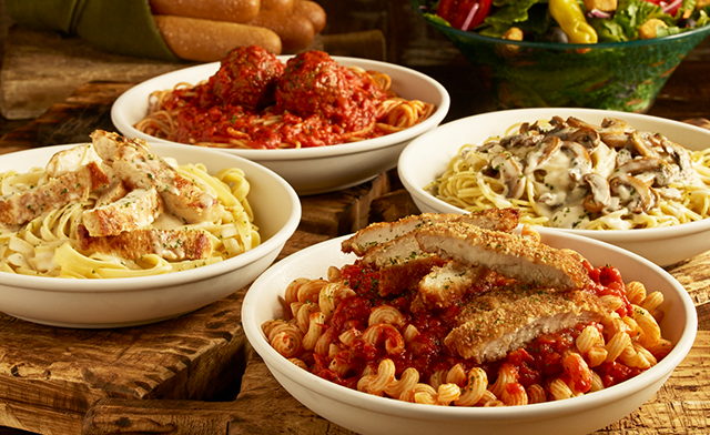 Enjoy endless bowls of your favorite pasta, sauce and topping combinations. Plus, unlimited soup or salad and breadsticks.