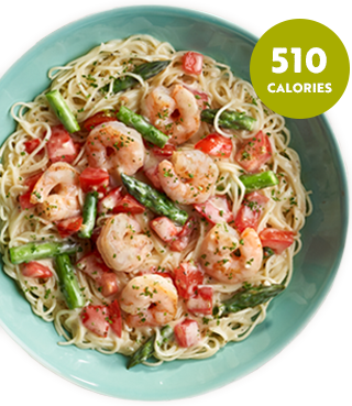 Inspired by Italy's southern coast, enjoy shrimp sautéed in garlic sauce and tossed with asparagus, tomatoes and angel hair pasta.