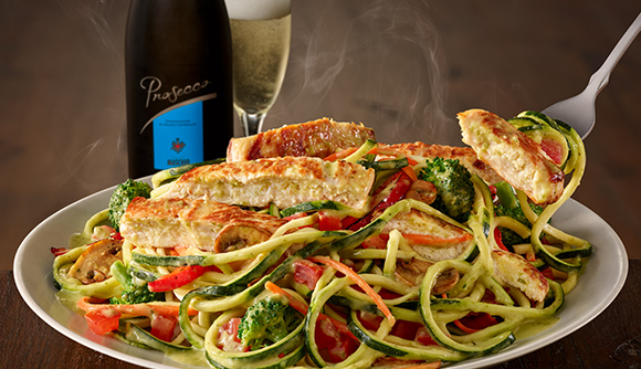 The fresh flavors of garden vegetables and light basil cream sauce in our New! Zoodles Primavera with Grilled Chicken go great with Maschio Sparkling Prosecco.
