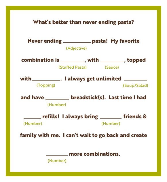 Get never ending servings of stuffed pastas, sauces and toppings.