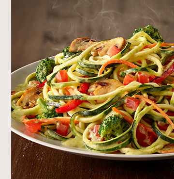 To our flavorful lighter side with Shrimp Scampi and Zoodles Primavera…
