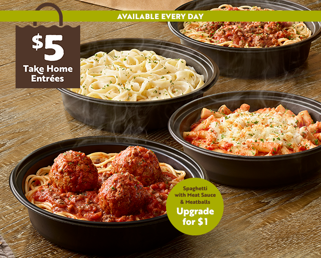 Choose from three classic entrées to take home for just $5 each. Plus, for a limited time, take home Spaghetti with Meat Sauce & Meatballs for just $1 more.*