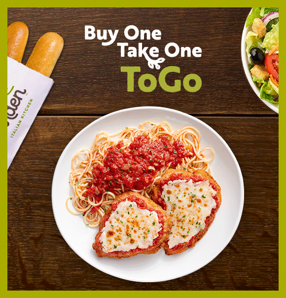 Treat the ones you love with two times their favorites ToGo. Enjoy one entrée served hot and a second freshly prepared, packaged and chilled for tomorrow. Plus, soup or salad and breadsticks. All for [$12.99]*.