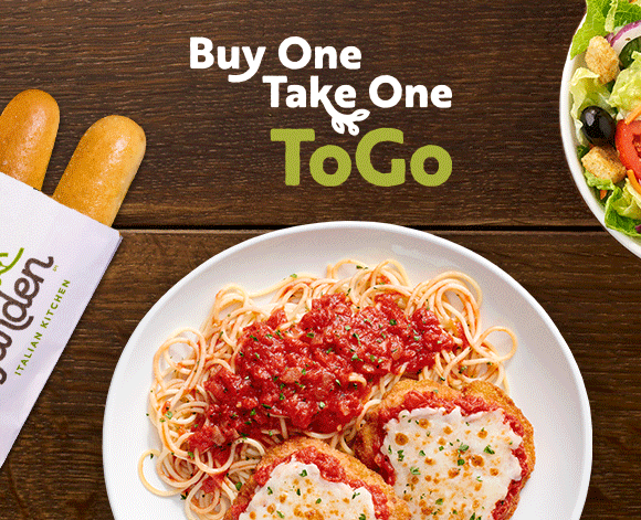 Give Mom two nights off with Buy One, Take One ToGo. Enjoy one entrée served hot and a second entrée freshly prepared and chilled for free. Plus, soup or salad and breadsticks. All for [$12.99]*.