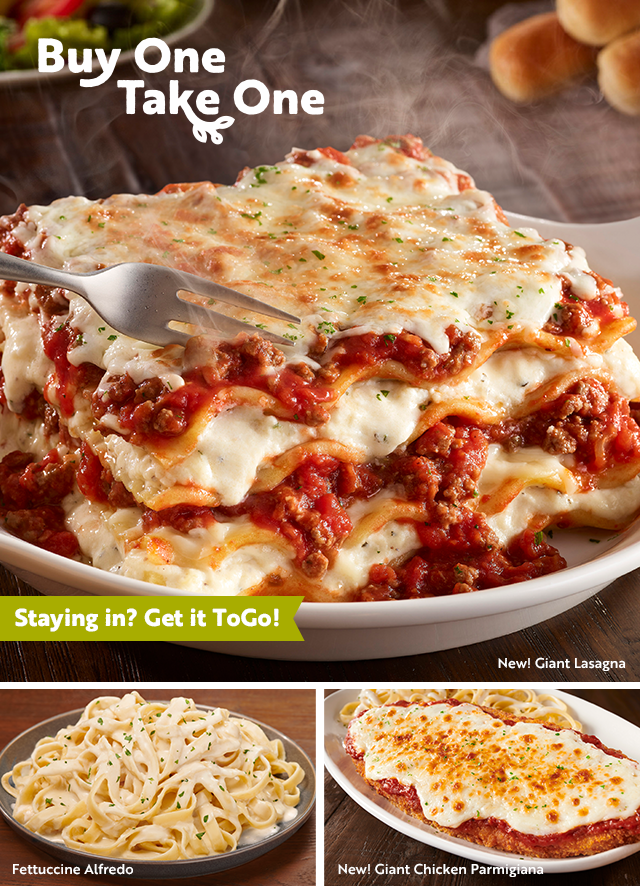 Join us for one entrée served hot, including New! Giant Lasagna, and get a second entrée freshly prepared and chilled for tomorrow for free. Plus, unlimited soup or salad and freshly baked breadsticks. Starting at $12.99*.