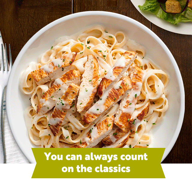 Whether you're craving our famous Chicken Alfredo or our New! Cheese Stuffed Shells, take comfort in the classics with us or ToGo tonight. Plus, soup or salad and breadsticks are always on us.