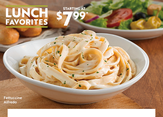 Choose a Lunch-Sized Favorite like Fettuccine Alfredo, Chicken Parmigiana or New! Cheese Stuffed Shells and pair it with your choice of homemade soup or garden fresh salad and freshly baked breadsticks. Starting at $7.99*.
