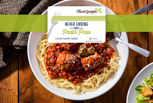 | Terms & Conditions: Never Ending Pasta Pass holder may redeem for unlimited Never Ending Pasta Bowl (NEPB) meals 9/25/2017–11/19/2017. Dine–in only. Offer is valid at any Olive Garden location in the U.S. (excluding Puerto Rico). Not valid for online or ToGo orders. Present to server at time of ordering. One redemption per visit. Each NEPB meal consists of pasta, sauce and a single topping serving from the promotional menu. All other entrées excluded. Each meal is for one person and may not be shared. Excludes gratuity, alcohol and any other menu item not listed herein. Pass is not a gift card and is not reloadable' is non-transferable without permission, holds no value and amount paid (if applicable) is non-refundable. Guest must be 18+ to purchase/use Pass. Use signifies agreement to all terms and Olive Garden's Privacy Policy www.olivegarden.com/privacy-policy. Questions? You many contact Olive Garden Guests Relations at (844) 209-3484. Expires 11/19/2017. |