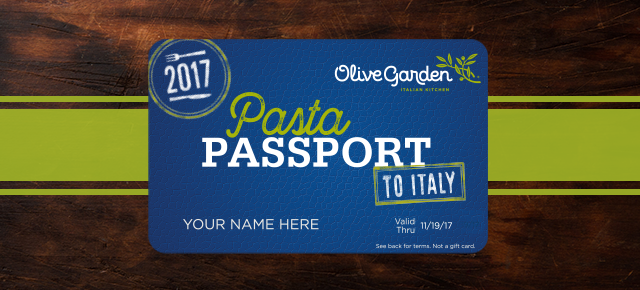 Terms & Conditions: Pasta Passport to Italy trip of a lifetime will take place April 7 - 14, 2018. Trip dates are not flexible; must be able to travel with the group on these dates. Trip for two includes roundtrip coach class airfare from the 48 continental United States to Italy for named Passholder and your guest (to be booked by a third party travel agency; flight times and schedule to be determined by third party travel agency), double-occupancy four-star hotel accommodations, ground transportation to/from airport in USA (purchaser and guest must arrive and depart from the same location), group ground transportation while in Italy, optional daily cultural and culinary activities, and three meals per day. Pass is non-transferrable, holds no value, and amount paid is non-refundable. Purchaser and guest must meet all travel requirements including valid passports or other mandatory travel documents. 18+ to purchase Pass; If guest is under 18 years old, must be accompanied by a parent or legal guardian. Named passholder may redeem for unlimited Never Ending Pasta Bowl® (NEPB) meals 9/25/17–11/19/17. Dine-in only. Valid at any Olive Garden location in the U.S. (excl. Puerto Rico). Not valid for online or ToGo orders. Present to server at time of ordering. One redemption per visit. Each "NEPB meal" consists of pasta, sauce, and a single topping serving from the promotional NEPB menu. All other entrees excluded. Each meal is for one person and may not be shared. Excludes gratuity, alcohol, and any other menu item not listed herein. Pass is not a gift card and is not reloadable; is non-transferable without permission, holds no value, and amount paid (if applicable) is non-refundable. 18+ to purchase Pass. Use signifies agreement to all terms and Olive Garden's Privacy Policy (www.olivegarden.com/privacy-policy) Questions? Olive Garden Guest Relations, (844) 209-3484. Expires 11/19/17. |