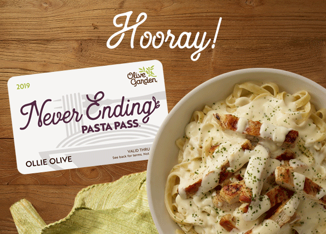 Present pass to server at time of ordering. Named Passholder may redeem for unlimited Never Ending Pasta Bowl® (NEPB) meals 9/23/19-11/24/19. Each “NEPB meal” consists of pasta, sauce and a single topping serving from the promotional NEPB menu. All other entrees excluded. Each meal is for one person and may not be shared. Dine-in only. Valid at any Olive Garden location in the continental U.S. Not valid for online or To Go orders. One redemption per visit. Excludes gratuity, alcohol and any other menu item not listed herein. Pass is not a gift card and is not reloadable; is non-transferable without permission, holds no value amount paid (if applicable) is non-refundable. Use signifies agreement to all terms and Olive Garden’s Privacy Policy (www.olivegarden.com/privacy-policy). Questions? Olive Garden Guest Relations, (844) 209-3484. Expires 11/24/19. © 2019 Darden Concepts, Inc.
