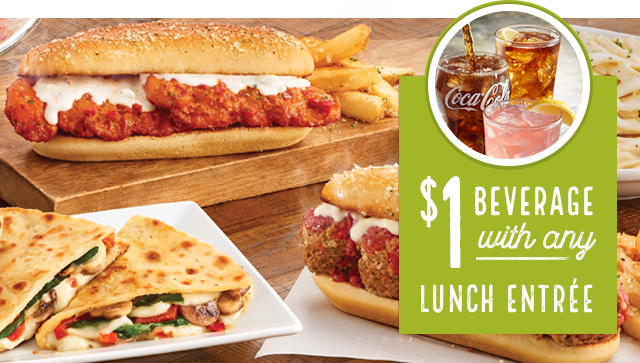 | Join us for lunch this week and get a beverage for just $1. Plus, as always, enjoy unlimited soup or salad and our famous breadsticks with any of our lunch entrées. |