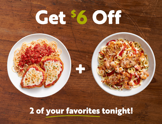 | This coupon may be redeemed for $6 off 2 adult dinner entrées on the same check. Limit two single adult dinner entrĂ©es per coupon. This offer cannot be prorated. Valid dine-in only. Coupon is not redeemable for cash, kids menu items, appetizers, or individual soup or salad. One coupon per check. Coupon cannot be combined with any other coupon or used with offers. Cash redemption value is 1/20 of one cent. Coupon may not be reproduced, sold, transferred or traded. Sales tax paid by bearer. Offer is valid at any Olive Garden Italian Restaurant location in the U.S. Visit olivegarden.com. © 2018 Darden Concepts, Inc. Offer Valid: [DATE]–[DATE]. |