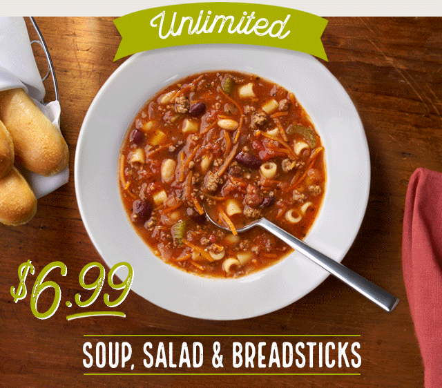 | For a limited time only, enjoy unlimited homemade soup, salad and our famous breadsticks for lunch for just $6.99. |