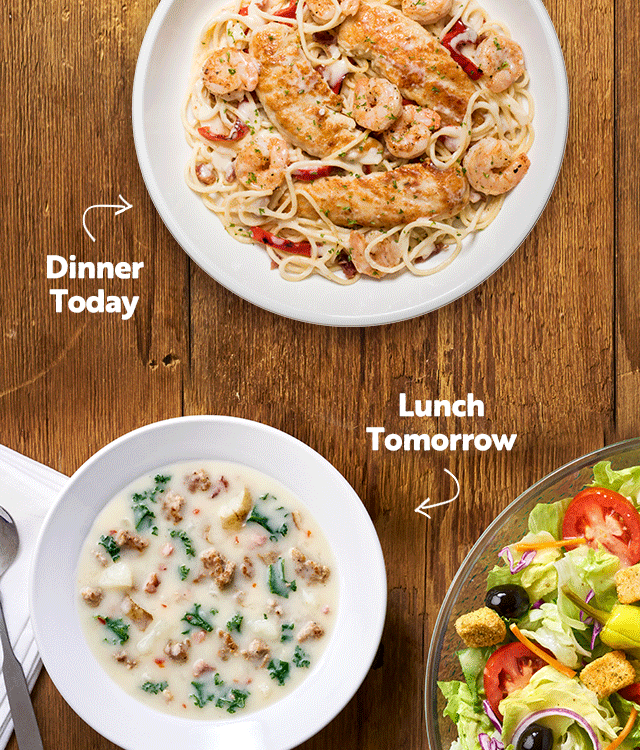 Enjoy your favorite dish with us tonight and take home lunch for tomorrow with a soup and salad on us!