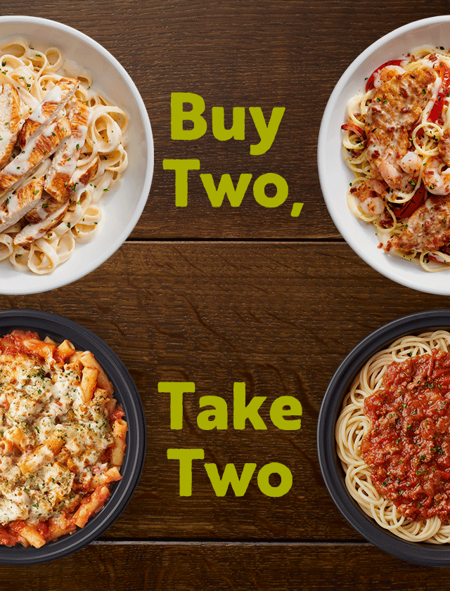 Join us now through [DAY] and enjoy any two dinner entrées paired with unlimited soup or salad and freshly baked breadsticks. Then choose two Take Home Entrées to enjoy on us!